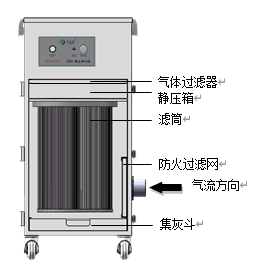1.煙塵廢氣通過吸煙管/吸煙口進入凈化機內(nèi),首先經(jīng)過均流板導(dǎo)流,