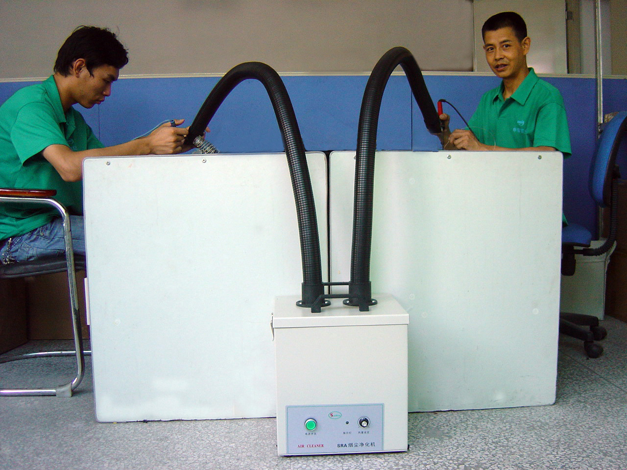 | 大多數的錫絲屬于無機化合物是一種低毒產品,短時間內接觸是沒有明顯的危害的,但長期接觸,或者錫煙濃度達到9.362mg/m3時,容易患錫塵肺,而且對神經有一定的毒害! 錫煙影響呼吸道初期問題有:正常呼吸有點困難,干咳,但不會影響工作能力。中期:在呼吸上明顯有點困難,影響工作的發揮。末期:沒有辦法工作。這個時候消化道出現惡性,嘔吐,腹痛,便秘皮膚可出現潰瘍神經毒害,早期為精神萎靡,明顯乏力,后期為慢性頭暈,頭痛。 因此在長期接觸錫煙需要注意防護。SRA焊錫煙霧凈化機,采用點對點凈化,快速、精準、便捷。萬向吸煙手臂,可隨意拉動固定,無需安裝管道,無需外排,凈化后達室內排放標準。根據工位安排可以選擇多種安裝方式。 1.單工位焊錫煙霧凈化機,適合零散、少數工位。