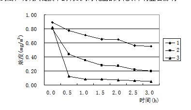 圖2 比較(圖2)中的三條凈化效率曲線可以看出,在相同的測試條件下,使用相同的技術,但是凈化效率卻有很大差異,2號產品能使甲醛濃度迅速下降,1h內即達到0.1mg/m3以下,可是1號產品在開啟3h后,甲醛濃度依舊在0.7mg/m3以上。許多研究表明,光催化可以在常溫常壓下即可將空氣中的有害氣體分解成無毒物質[7],而且沒有二次污染,是一種有效的去除各種室內污染物的先進技術,但在我們測試的同時檢測環境艙內的臭氧濃度,發現臭氧濃度在光催化技術的凈化器凈化過程中均有不同程度的升高。這說明在考慮選擇光催化凈化產品的同時,不應該忽視其副產物臭氧的存在。另外光催化產品還存在催化劑失活的現象。催化失活是指催化劑表面被反應產物或顆粒物覆蓋,失去催化效果,必須及時更換核心部件。因此如何選擇副產物的生成量較小,并且壽命較長的催化產品是催化劑類凈化器選型的關鍵。同一臺凈化機改進前后凈化效率的比較 由于同種技術的凈化效果會因為設計工藝或者制造技術的不同形成較大差異,所以很多凈化器廠家也在不停的改進生產,希望可以得到效果好、副產物少、壽命長的產品。圖3中表示的是一家使用復合式技術廠家生產的凈化產品,主要采用的技術有過濾、吸附、高壓靜電和負離子,(圖1、2、3)中曲線分別是同一臺凈化器未經過改進和兩次改進后得到的凈化效率曲線,三次試驗時凈化器內部結構基本相同,只是在關鍵技術處做出調整,測試時得出的凈化效率有明顯差異。從圖中可以清晰的看出,三條凈化效率曲線明顯由低到高,說明關鍵技術的調試對凈化器的凈化效率有顯著影響。