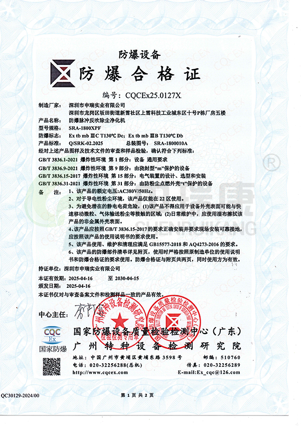 在鋁合金 / 鎂合金打磨、面粉加工、鋰電焊接、家具粉塵等易燃易爆粉塵工況中,整機防爆認證是除塵凈化設備合法準入、安全運行的核心憑證。申瑞實業(申瑞康)旗下 SRA-1800XPF防爆脈沖反吹清灰凈化機,已取得國家權威機構頒發的整機粉塵防爆合格證,為高風險粉塵環境提供合規、可靠的凈化解決方案。 一、整機防爆證書核心信息(權威合規) 1. 認證概況 產品: SRA-1800XPF防爆脈沖反吹清灰凈化機 認證類型:整機粉塵防爆合格證(非僅電機 / 部件認證) 執行標準:GB 12476.1-2013《可燃性粉塵環境用電氣設備 第 1 部分:通用要求》、GB/T 3836.1-2021《爆炸性環境 第 1 部分:設備通用要求》 防爆標志:Ex tD A21 IP65 T135℃(適用于 21 區可燃性粉塵環境,設備最高表面溫度≤135℃,防護等級 IP65) 發證機構:國家授權防爆檢測機構(CQST、PCEC、NEPSI 等),證書可官方核驗 證書有效期:5 年,到期前需完成換證復審 2. 證書關鍵要素(核驗要點) 證書編號:唯一可追溯編碼,用于官網核驗真偽 整機型號:與設備銘牌、產品型號完全一致 防爆等級:明確標注粉塵防爆等級(Ex tD A21),非氣體防爆(Ex d/Ex i) 適用環境:限定為可燃性粉塵爆炸危險場所(21 區) 簽發日期與有效期:確保證書在有效期內,無過期、涂改痕跡 發證機構公章:國家防爆檢測機構專用章,具備法律效力 二、整機防爆 vs 部件防爆:為何必須整機認證? 1. 核心區別
